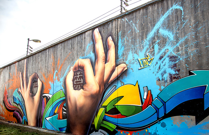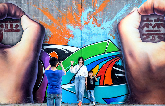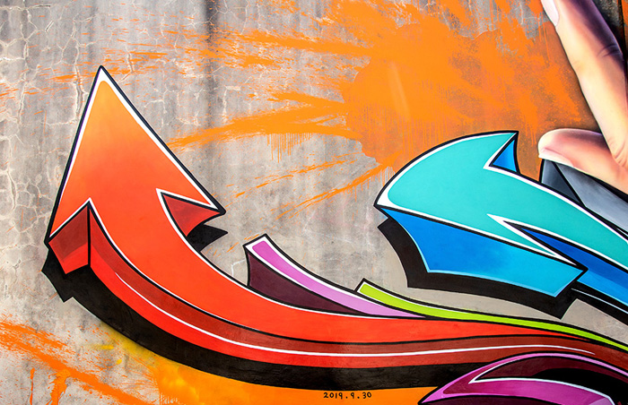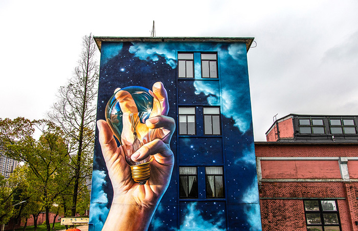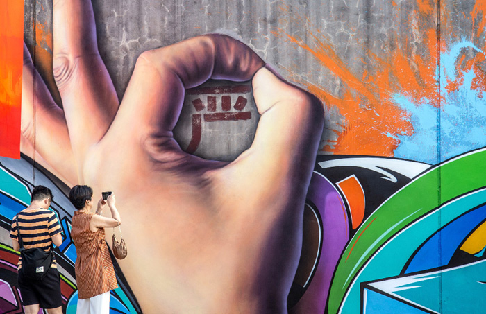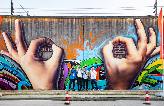 曾经的监YU,对外界来讲是神秘的,如果它的外墙上想要绘画,适合用什么样的主题呢?我们选择做了一个往里看的手势,同时保留墙面上曾经的“严禁”二字的原始痕迹,这样跟园区改造的初衷也保持一致,表现出巨大的反差。